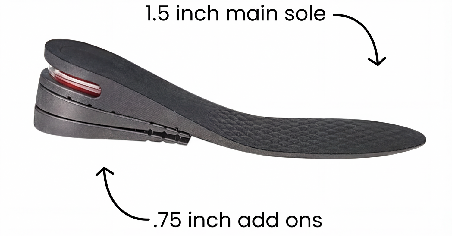 Each MaxSole includes three adjustable layers: one main sole that adds 1.5 inches, and two add-on layers that add 0.75 inches each. Wear them individually or stack them together to customize your height—whether you want a subtle lift or the full 3-inch boost. MaxSoles adapt to your day, your shoes, and your confidence.
